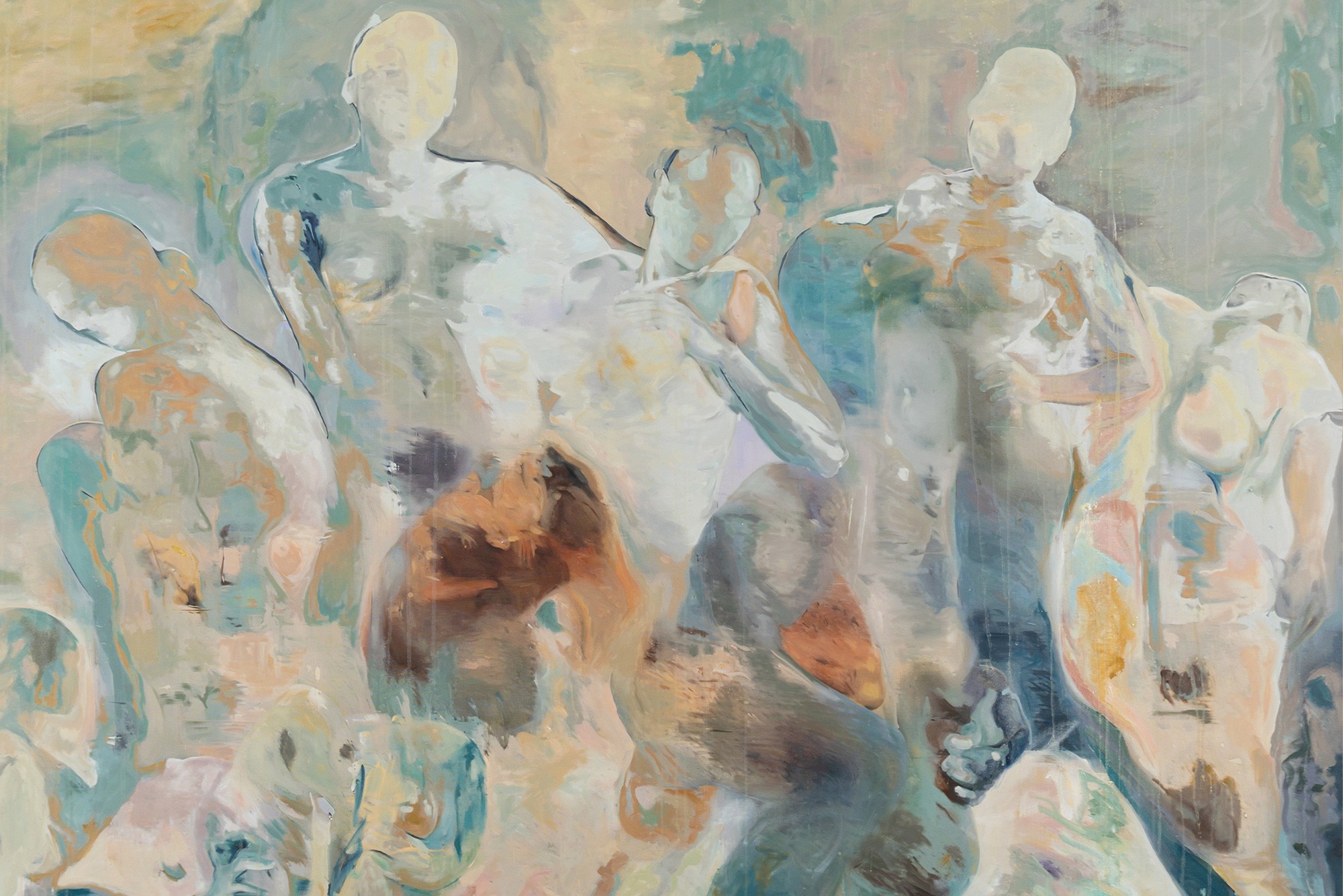 « Les peintures réalisées pour l’exposition se caractérisent par une densité extrême. Avec ces grandes toiles, Alaoui convoque l’histoire de la peinture. Les formats monumentaux, la pluralité de figures, la présence de scènes d’intérieur et de draperies diffuses évoquent la peinture d’Histoire. Ici, aucune narration lisible ne s’impose, le sens n’est jamais donné frontalement. L’artiste retient de la tradition non pas son récit, mais son pouvoir d’intensification : le tableau comme monde saturé. Les corps féminins y apparaissent en groupes, en amas, en configurations instables où aucune figure ne se détache définitivement comme centre. Cette stratégie compositionnelle empêche toute appropriation rapide de l’image. Le regard ne peut pas « saisir » un corps isolé ; il est contraint de naviguer dans un champ de relations.